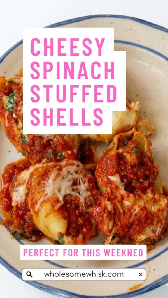 stuffed shells, spinach shells, ricotta pasta bake, cheesy pasta, Italian dinner, vegetarian pasta