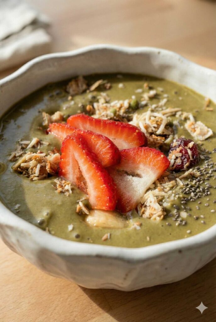 Frozen bananas create that thick, ice-cream-like texture we all crave. Spinach blends in quietly, adding nutrients without changing the flavor. The chocolate protein and collagen make it satisfying enough to carry you through busy workdays, school runs, or workouts. And those toppings? That is where personality shines. Crunchy granola. Bright strawberries. Maybe a drizzle of nut butter if you are feeling extra.