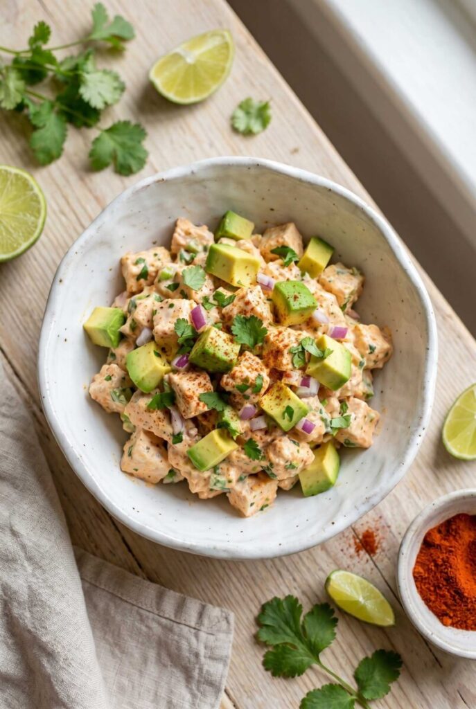 This recipe actually became a favorite in my kitchen during busy weekdays. I often had leftover rotisserie chicken sitting in the fridge, and instead of reheating it the usual way, I started mixing it with creamy ingredients like Greek yogurt and mayonnaise. When I added avocado one afternoon, it completely changed the dish. The avocado brought a buttery texture that made the salad taste rich without feeling heavy.