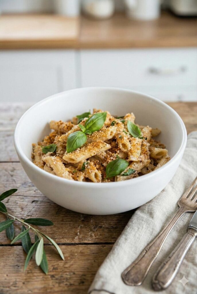Mix topping ingredients and sprinkle evenly over the pasta. Broil at 450°F for about 5 minutes until golden and crispy. Garnish with basil and serve hot.