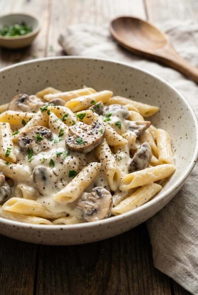 There is something incredibly comforting about a bowl of creamy mushroom penne pasta. It reminds me of quiet evenings when the kitchen feels warm and inviting, and the simple act of stirring a sauce becomes a small moment of peace. The aroma of garlic sizzling in butter instantly changes the mood of the house. Mushrooms soften and release their earthy fragrance, and suddenly it feels like you are cooking something special, even though the ingredients are humble and familiar.