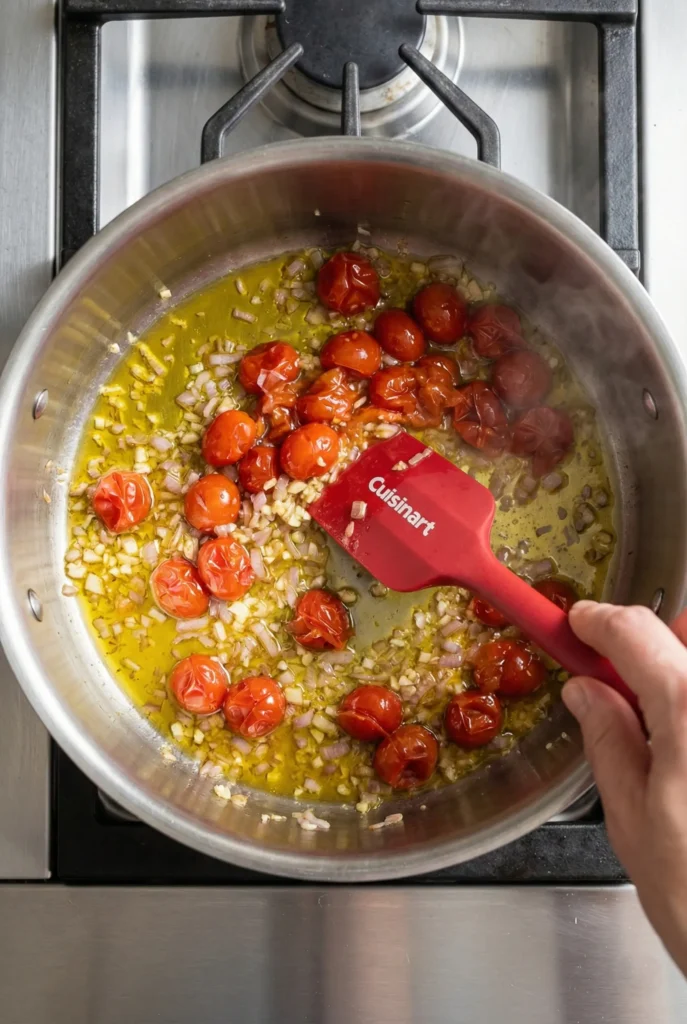 Heat the olive oil in a large pot over medium-high. Add shallots, garlic, and cherry tomatoes. Sauté 5–6 minutes until the tomatoes burst. A Cuisinart Silicone Spatula makes stirring easy, but any spatula works.