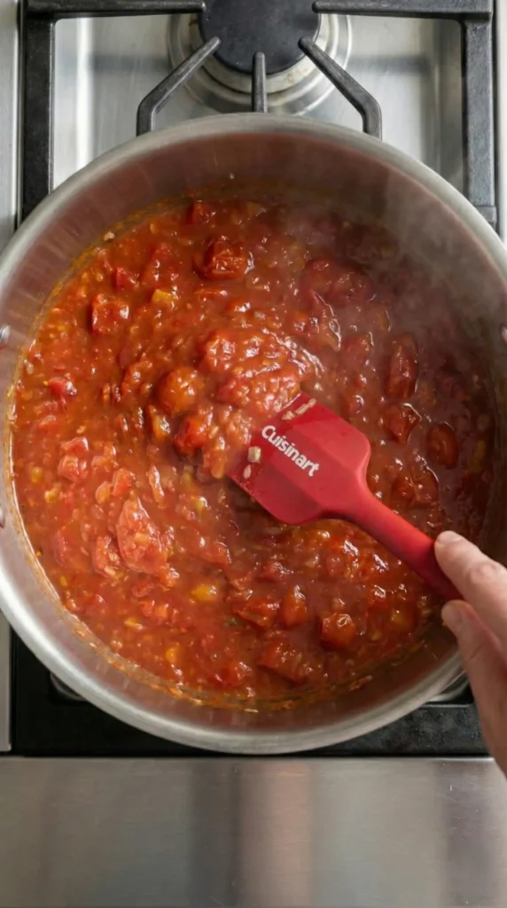 Add the canned petite diced tomatoes and let them cook 1–2 minutes. Break them down with your spatula or use an immersion blender to puree part of the sauce.