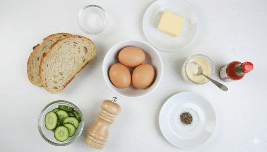 🍳 Eggs, 🧈 Butter, 🧂 Salt, 🍞 Bread, 🥒 Cucumber, 🌶️ Hot Sauce, 🥄 Mayonnaise, ⚫ Black Pepper
