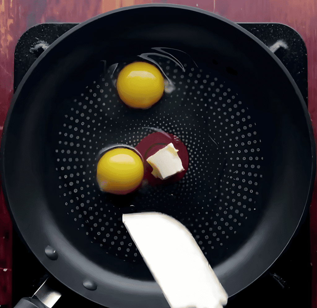 Place a cold pan on the stove. Add 2 eggs and ½ tsp butter.