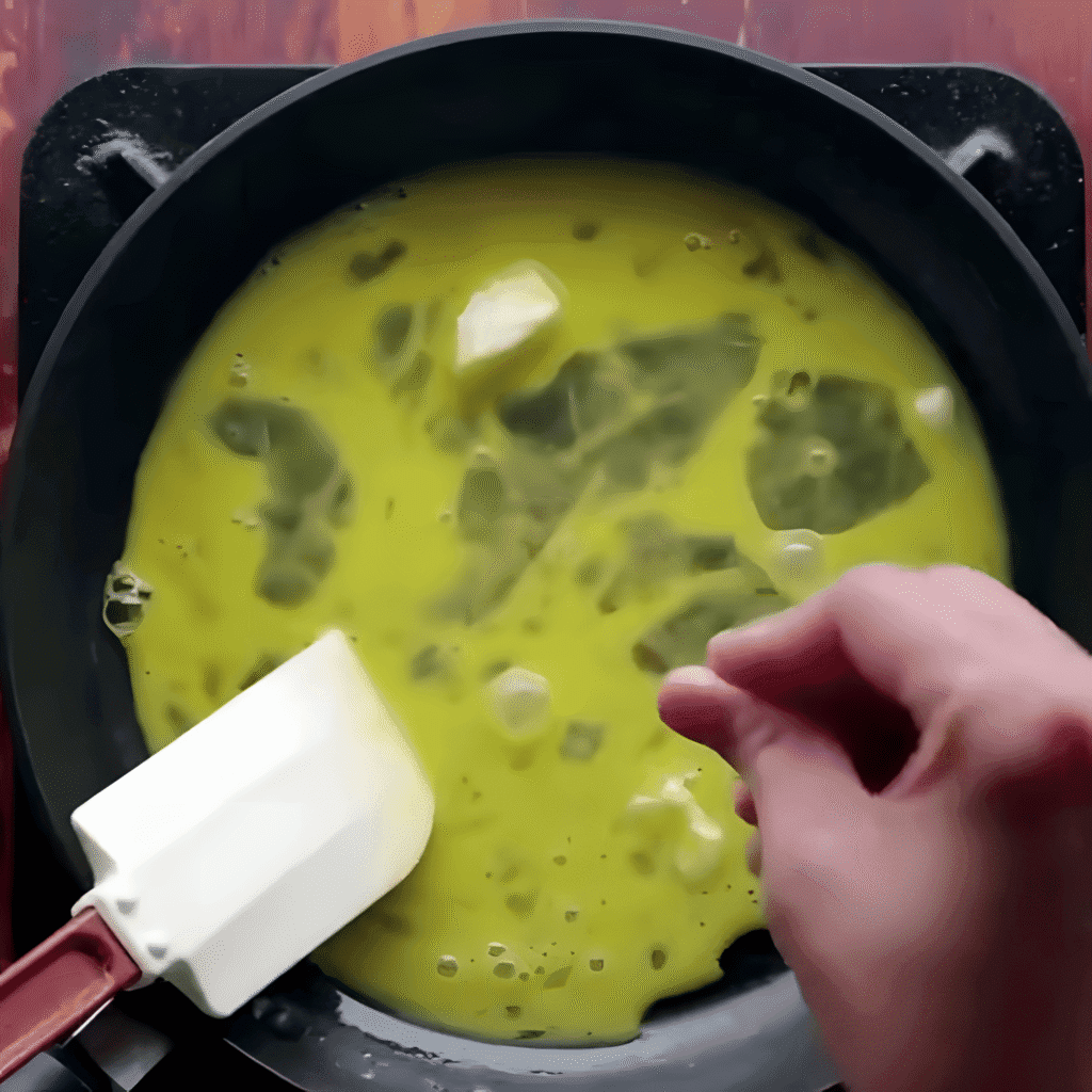 Cook on low heat, stirring gently until the eggs begin to thicken softly.