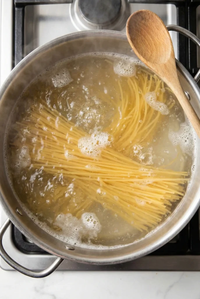 Cook pasta in salted water and reserve ½ cup pasta water.