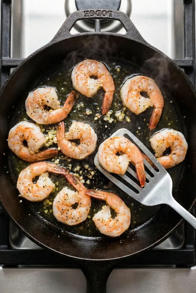Pat the shrimp dry, season with salt, pepper, and garlic. Heat olive oil in a pan and sear shrimp for 2–3 minutes per side until opaque. A Lodge Cast Iron Skillet works well, but your regular pan is great too.