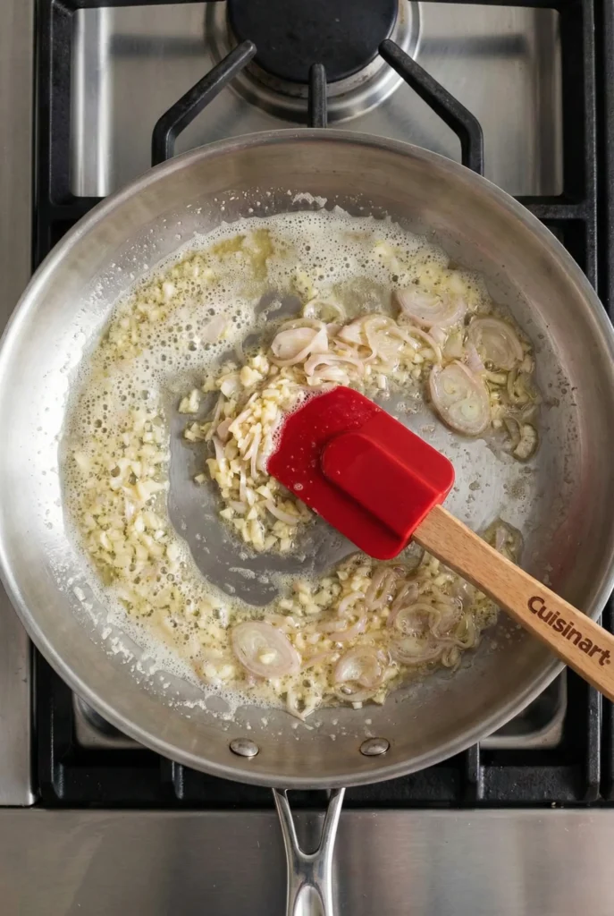 Lower heat and melt butter. Add garlic and shallot, sautéing until softened. Use a Cuisinart Silicone Spatula or whatever you have at home to stir.