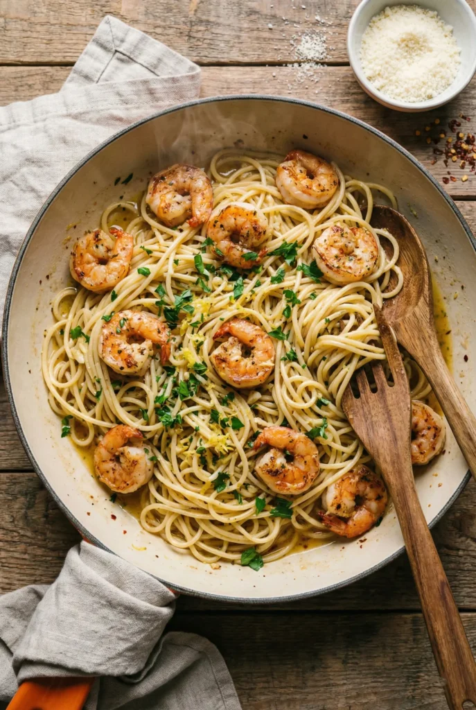 This Garlic Butter Shrimp Pasta blends juicy, perfectly seasoned shrimp with a velvety garlic-butter sauce, fresh herbs, chili flakes, and Parmesan. It’s simple enough for weeknights yet elegant enough for guests, with bold flavors that come together quickly in one pan.