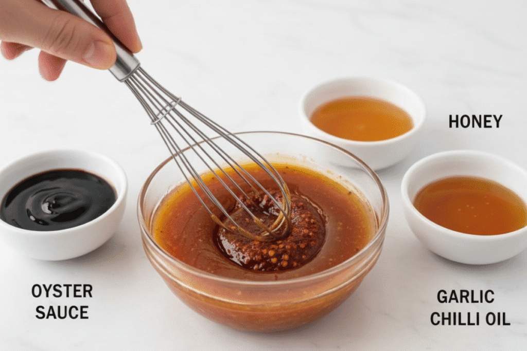In a small bowl, whisk together oyster sauce, honey, and garlic chili oil until it’s smooth and glossy.