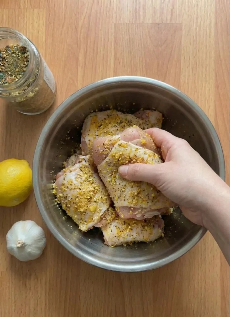 Season the chicken thighs generously with Lemon Butter Garlic seasoning. I like to mix everything in the OXO Good Grips 3 Quart Mixing Bowl, but any bowl works fine.
