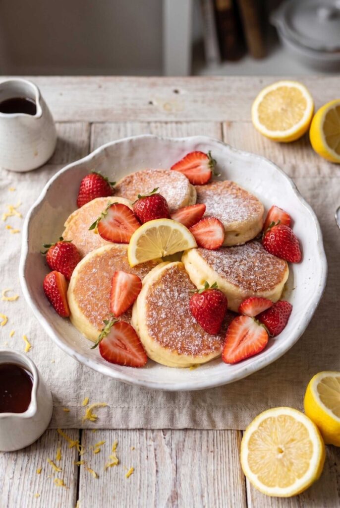 Fresh strawberries are the perfect finishing touch. Their natural sweetness balances the lemon perfectly. Sometimes I add maple syrup, sometimes just powdered sugar, and occasionally a little honey. But honestly, the pancakes are delicious even on their own.