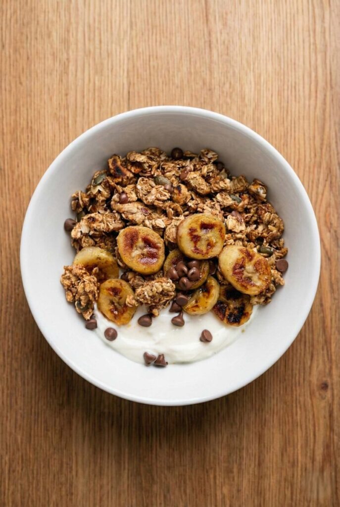 This peanut butter banana breakfast bowl combines crispy oat crumble, caramelized bananas, creamy yogurt, and a hint of chocolate for a nourishing start.