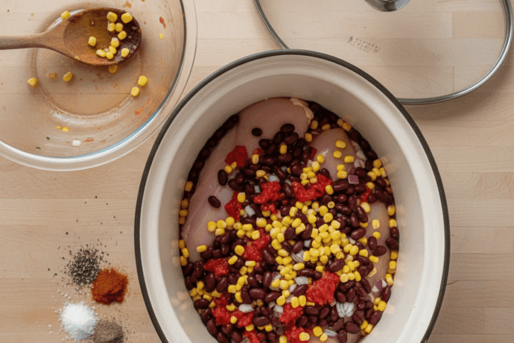 Add your chicken breasts, black beans, kidney beans, corn kernels, crushed tomatoes, and diced onion into your slow cooker. Make sure everything is spread out evenly before seasoning.