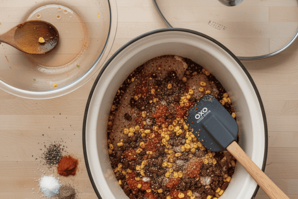 Sprinkle in the crushed chili, taco seasoning, salt, and pepper. Stir everything together so the spices coat the chicken and vegetables nicely. A flexible OXO Good Grips Silicone Spatula works great here to mix without scratching your slow cooker’s surface.