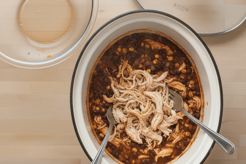 Once the chicken is tender and fully cooked, use two forks to gently shred it right inside the slow cooker. Stir everything back together so the shredded chicken soaks up all that flavorful sauce.