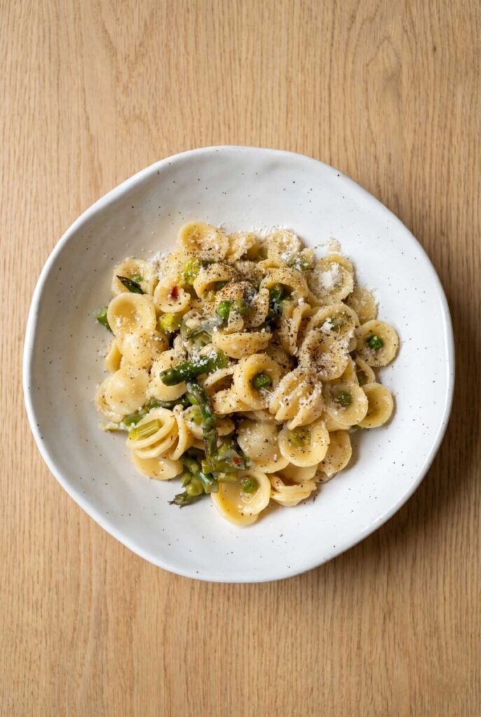 The recipe centers around fresh vegetables and simple pantry staples. Protein from peas and Parmesan adds balance to the meal. It feels hearty without relying on meat or complicated substitutes.